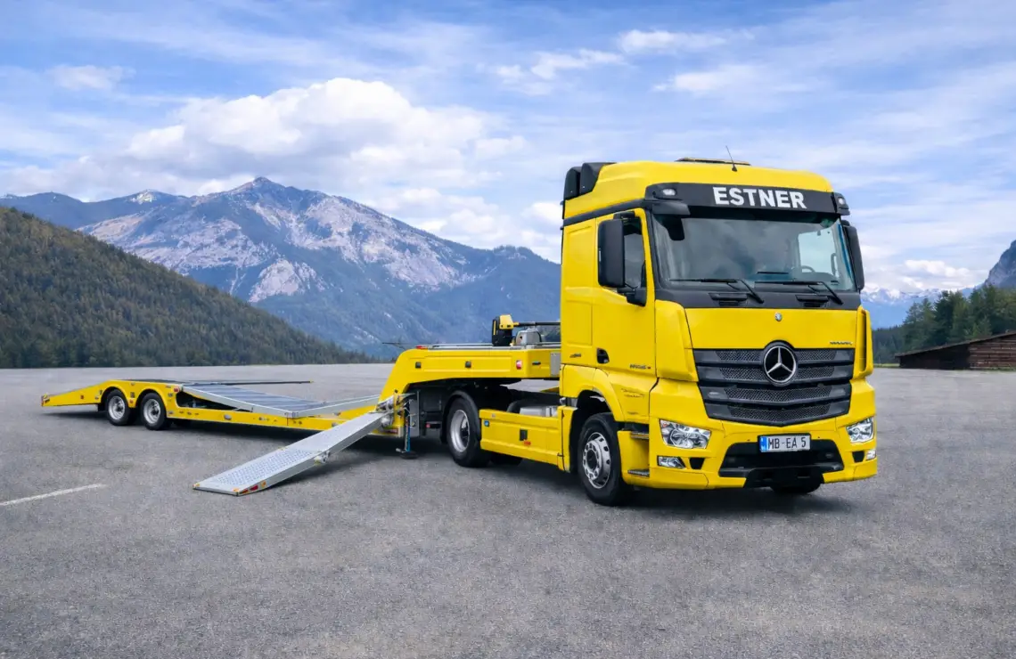 Absenkbarer Sattelauflieger mit Schwanenhals für sichere und effiziente Fahrzeugtransporte. In Kombination mit einer Mercedes Actros Zugmaschine ermöglicht das System ein komfortables Be- und Entladen über die elektrische Rampe – ideal für tiefergelegte oder nicht fahrbereite Fahrzeuge.
