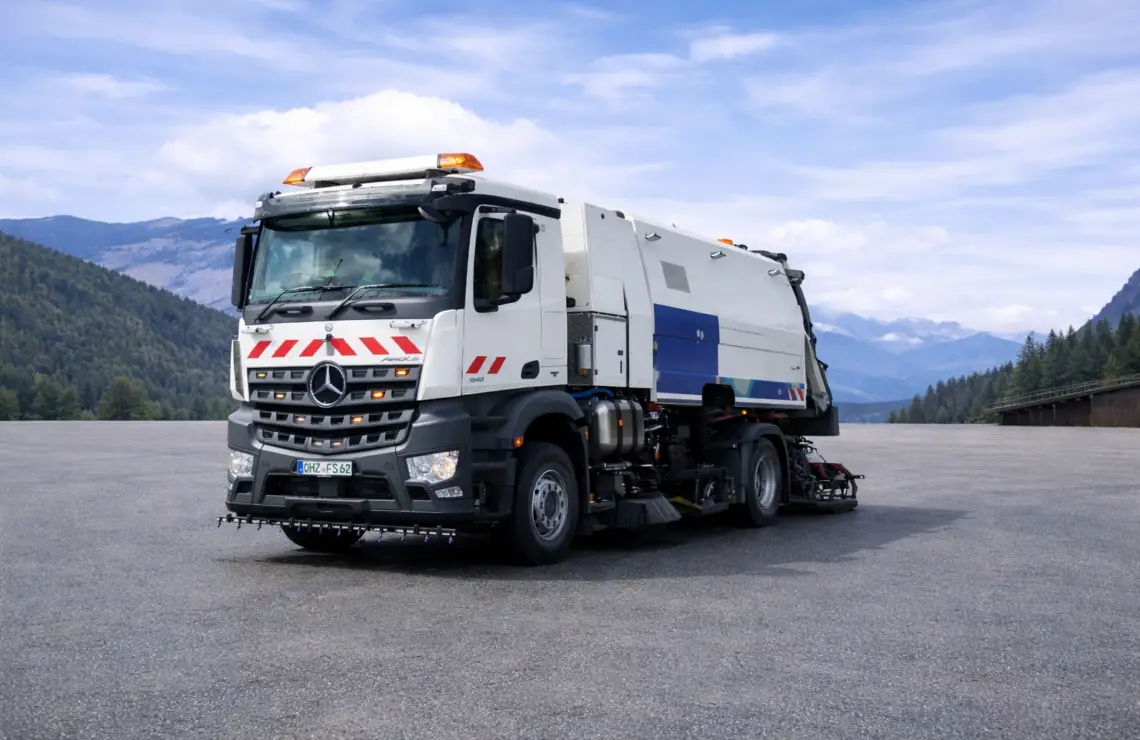 Leistungsstarkes Spezialfahrzeug für professionelle Ölspurbeseitigung und Straßenreinigung. Der Mercedes Arocs sorgt für schnelle, umweltgerechte Reinigung von Verkehrsflächen – auch bei schwierigen Witterungsbedingungen.