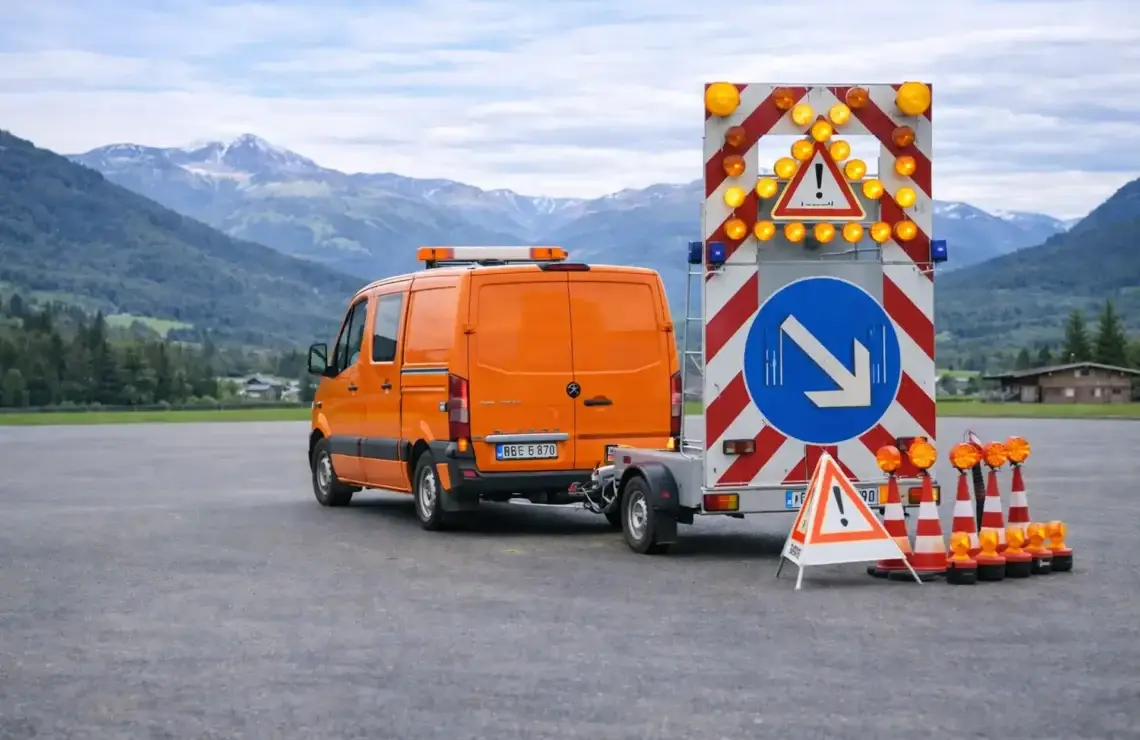 Einsatzfahrzeug für die mobile Verkehrsabsicherung im Straßenbau. Der Mercedes Sprinter in Signalfarbe Orange ist mit einem voll ausgestatteten Verkehrssicherungsanhänger für Tages- und Nachtbaustellen im regionalen Einsatz unterwegs.