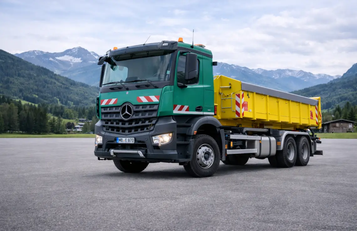 Leistungsstarker Abrollkipper für Materialtransporte im Straßenbau und Umweltservice. Ideal für Schüttgut, Aushub, Asphaltreste und Containerlogistik auf Baustellen und Infrastrukturprojekten.